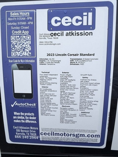 Crystal Red Metallic 2023 Lincoln Corsair Standard FWD 8-Speed Automatic 2.0L Turbocharged 1 OWNER, Factory Warranty, 10 Speakers, 18 Bright Machined Aluminum Wheels, 60/40 EasyFold Rear Seat w/Power Seatback Release, Equipment Group 101A, Frameless Auto Dimming Rearview Mirror, Hands-Free Liftgate, Heated Sideview Mirrors, Heated Steering Wheel, Heated/Ventilated Driver & Front Passenger Seats, Memory seat, Micro-Perforated Lincoln Soft Touch Seats, Navigation system: Connected Navigation (3-year trial), Phone As A Key (PAAK), Power driver seat, Power Tilt/Telescoping Steering Column w/Memory, Rain Sensing Wipers, Universal Garage Door Opener, Windshield Wiper De-Icer, Wireless Charging Pad.