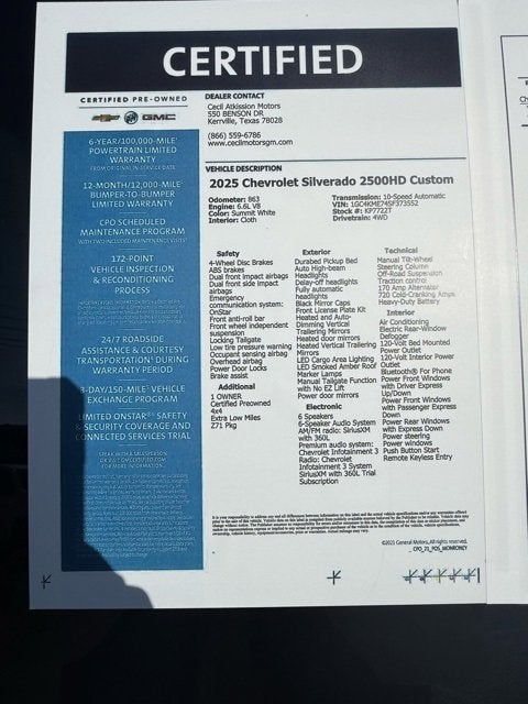 Summit White 2025 Chevrolet Silverado 2500HD Custom 4WD 10-Speed Automatic 6.6L V8 1 OWNER, Certified Preowned, 4x4, Extra Low Miles, Z71 Pkg, 10-Speed Automatic, 4WD, Black Cloth, 10-Way Power Driver Seat Adjuster with Lumbar, 120-Volt Bed Mounted Power Outlet, 120-Volt Interior Power Outlet, 170 Amp Alternator, 2-Speed Electronic Shift Transfer Case, 3.5 Diagonal Monochromatic Display DIC, 3.73 Rear Axle Ratio, Alloy wheels, Apple CarPlay/Android Auto, Auto-Dimming Inside Rear-View Mirror, Black Mirror Caps, Bluetooth® For Phone, Chevrolet Connected Access Capable, Color-Keyed Carpeting Floor Covering, Compass, Custom Convenience Package, Custom Value Package, CX Safety Package, Deep-Tinted Glass, Dual Rear USB Ports (charge Only), Durabed Pickup Bed, Electric Rear-Window Defogger, Electronic Cruise Control with Set and Resume Speed, EZ Lift Power Lock and Release Tailgate, Front Rubberized Vinyl Floor Mats, HD Rear Vision Camera, Heated and Auto-Dimming Vertical Trailering Mirrors, Heated Vertical Trailering Mirrors, Hill Descent Control, Lane Change Alert with Side Blind Zone Alert, LED Cargo Area Lighting, Locking Tailgate, Manual Tailgate Function with No EZ Lift, Manual Tilt-Wheel Steering Column, Off-Road Suspension, OnStar Services Capable, Panic alarm, Power Door Locks, Power Front Windows with Driver Express Up/Down, Power Front Windows with Passenger Express Down, Power Rear Windows with Express Down, Power Take-Off, Preferred Equipment Group 1CX, Premium audio system: Chevrolet Infotainment 3, Push Button Start, Rear 60/40 Folding Bench Seat (folds Up), Rear Cross Traffic Alert, Rear Rubberized Vinyl Floor Mats, Remote Keyless Entry, Remote Vehicle Starter System, SiriusXM with 360L Trial Subscription, Standard Tailgate, Suspension Package, Ultrasonic Front and Rear Park Assist, Unauthorized Entry Theft-Deterrent System, Wheels: 20 10-Spoke Machined Aluminum, Wi-Fi Hotspot Capable, Wireless Phone Projection, Z71 Off-Road Package.WE ARE OPEN FOR ALL YOUR SALES AND SERVICE NEEDS!!! Recent Arrival! Odometer is 27550 miles below market average!CALL 866-240-2964 TO SCHEDULE YOUR TEST DRIVE TODAY!!!