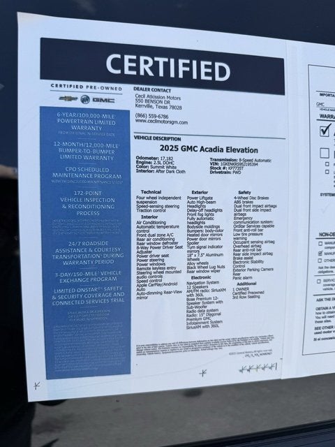 Summit White 2025 GMC Acadia Elevation FWD 8-Speed Automatic 2.5L DOHC 1 OWNER, Certified Preowned, 3rd Row Seating, FWD, After Dark Cloth, 2-Way Driver Power Lumbar Seat Adjuster, 4-Way Manual Front Passenger Seat Adjuster, 8-Passenger Seating (2-3-3 Seating Configuration), 8-Way Power Driver Seat Adjuster, Apple CarPlay/Android Auto, Bose Premium 12-Speaker System with Sub-Woofer, Heated Driver and Front Passenger Seats, Navigation System, Power Liftgate, Preferred Equipment Group 4SC, Rear air conditioning, Steering wheel mounted audio controls.